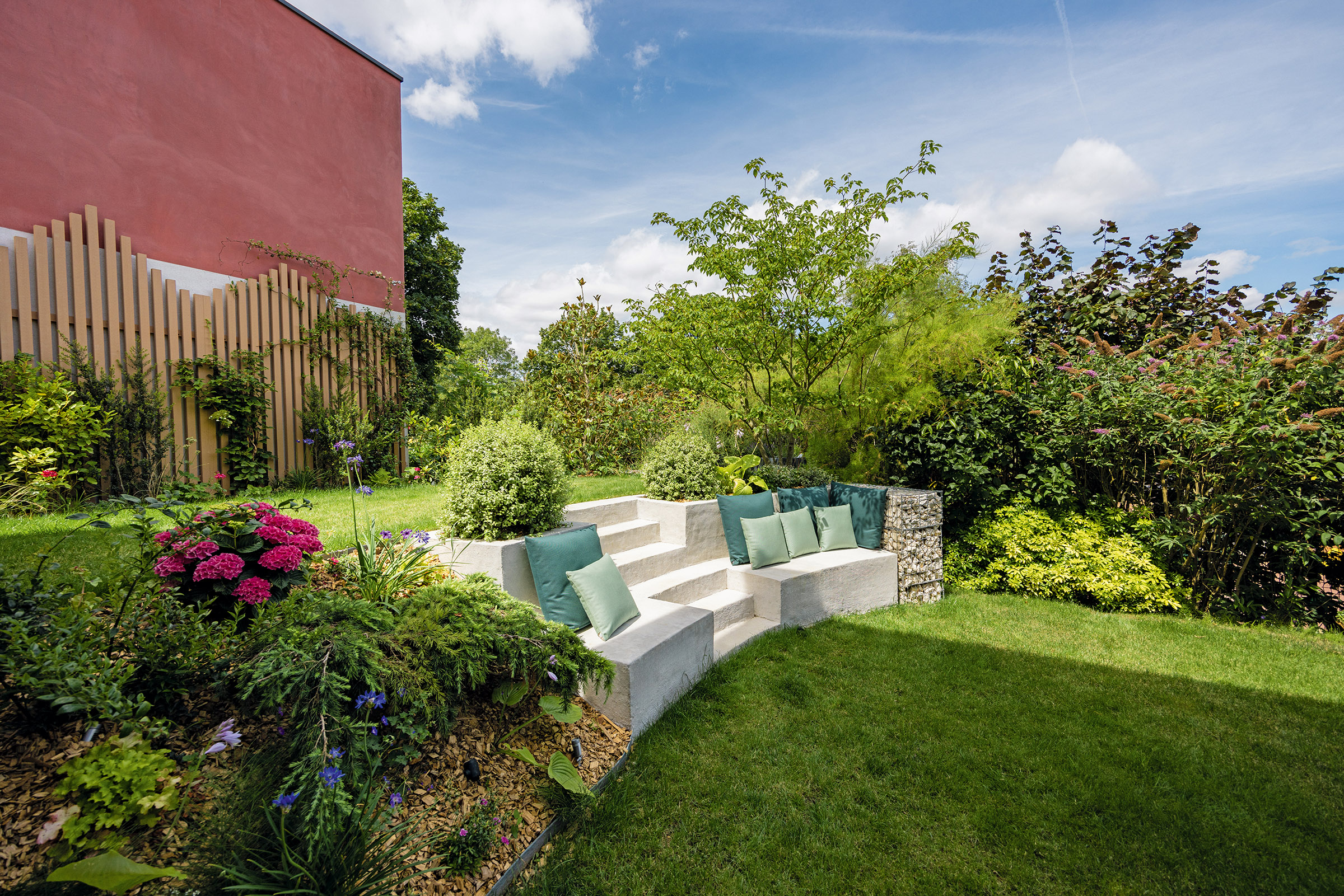 Pour pleinement profiter de ces espaces, il a fallu apporter de la terre sur le haut du terrain et créer un plateau en prolongement de la terrasse. L’utilisation de galbion en mur de soutènement permet à l’eau de passer à travers le mur sans ruisseler dans le jardin en contrebas.