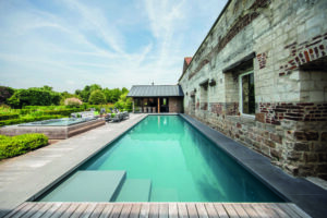 Cette rénovation atypique, réalisée par l’esprit piscine sur le Bassin d’Arcachon, a débuté par un projet de rajeunissement du bassin. Cependant, la sécheresse hivernale et les incendies de 2022 ont orienté le propriétaire vers un usage de l’eau plus durable. Une partie de l’ancienne piscine a ainsi été transformée en réserve, installée sous la nouvelle terrasse et alimentée par le trop-plein des eaux de pluie. Cette réserve compense l’évaporation, permet de laver le filtre et contribue à maintenir la qualité de l’eau. Pour limiter davantage les pertes, une forme rectangulaire a été choisie, facilitant l’installation d’un volet immergé. Les nouvelles parois ont été coulées dans un coffrage isolant, réduisant ainsi les coûts de chauffage. Un dispositif anti-incendie innovant a également été installé dans le local technique, permettant d’utiliser l’eau de la piscine et de la réserve en cas de feu dans la forêt voisine. Côté esthétique, l’alliance du bassin en béton armé gris ardoise, de la plage et des margelles en pierre, coloris sable blanc, apporte une touche chic et contemporaine, rappelant le style épuré des piscines californiennes.