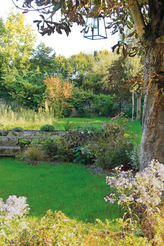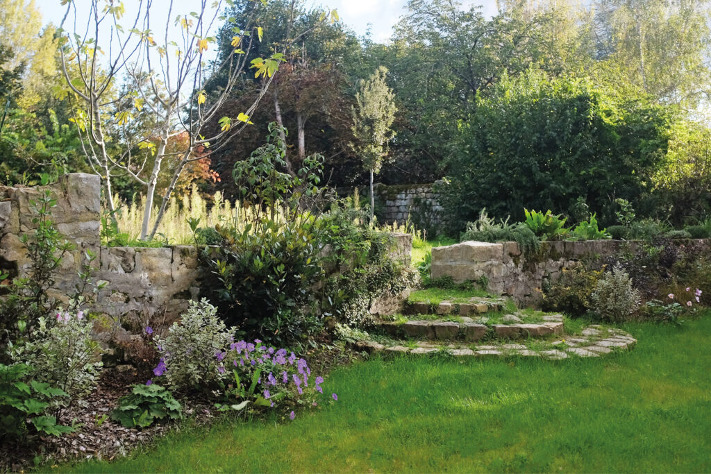 Autrefois marqué par une vaste terrasse pavée et des structures en pierre comme des arches, un puits ou un four à pain, ce jardin rigide et minéral a été transformé pour renouer avec la nature.