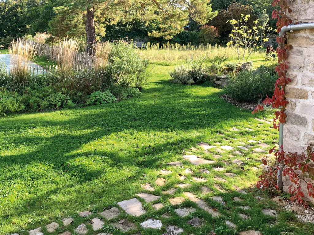 La paysagiste a supprimé la majorité des terrasses carrelées, réengazonnant presque toute la surface pour offrir un tapis verdoyant invitant à la promenade. Près de la cuisine, une petite zone pavée subsiste, agrémentée de joints enherbés, créant une transition douce entre la maison et l’extérieur.