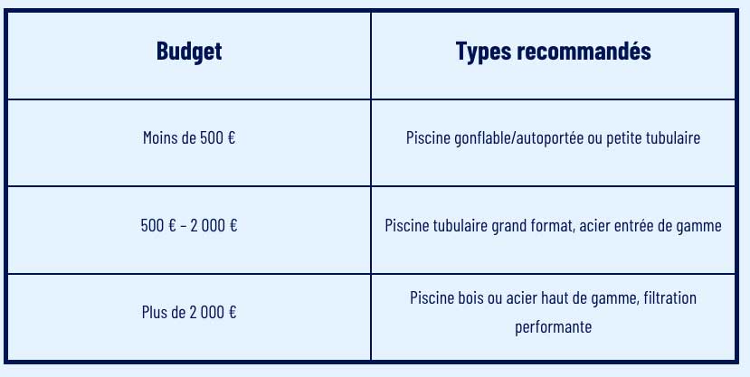 Pour un usage saisonnier, comptez 300 à 800 € pour une piscine tubulaire de bonne qualité. Pour un projet durable, prévoyez 2 000 à 7 000 € pour un modèle bois ou acier.