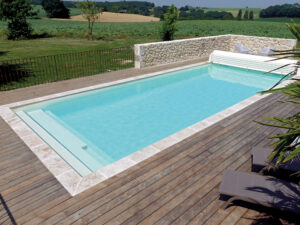 Équipements : Couverture immergée, caillebotis immergés, traitement au sel automatique, pompe doseuse pH, pompe à chaleur