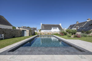 Le client a opté pour le concept Piscine Plage®, pensé pour procurer les avantages de la plage sur un modèle de piscine. L’eau, sur son bord en pente douce, est toujours plus chaude, et la totalité du volume d’eau du bassin en bénéficie. La température de l’eau est de deux à trois degrés plus élevée que dans une piscine classique, ce qui est facilité par un moindre volume puisque cette piscine de 8,30 m par 4, avec une profondeur maximum d’1,30 m, contient seulement 30 m3 d’eau. Un atout économique qui n’est pas à négliger. Avec son aspect de lagon, obtenu par le dégradé de couleur bleue et turquoise, les couleurs emblématiques des destinations de rêve, des criques isolées, la piscine propose autant de promesses d’évasion… au bord de sa maison. La réussite d’une telle piscine repose aussi « sur son environnement », explique son concepteur Jérôme Brens qui est également paysagiste. La mise en scène des abords du bassin est régie par la simplicité : « garder de l’espace de vie tout autour, mélanger les matériaux et deux ou trois coloris, et surtout ne pas « bétonner » ou poser du carrelage partout ».