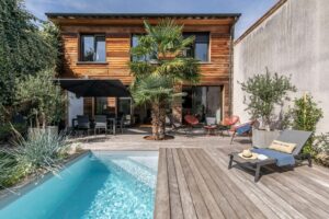 Profitant de la rénovation complète de la maison et du réaménagement du terrain, le jardin s’est offert une destination supplémentaire, la plage. Sur la partie bien exposée au soleil, la piscine a trouvé sa place. Elle s’étire le long du nouveau bâtiment de la maison, devant les baies vitrées. Elle est ainsi idéalement placée pour s’offrir à la vue et à la baignade à tout moment de la journée.