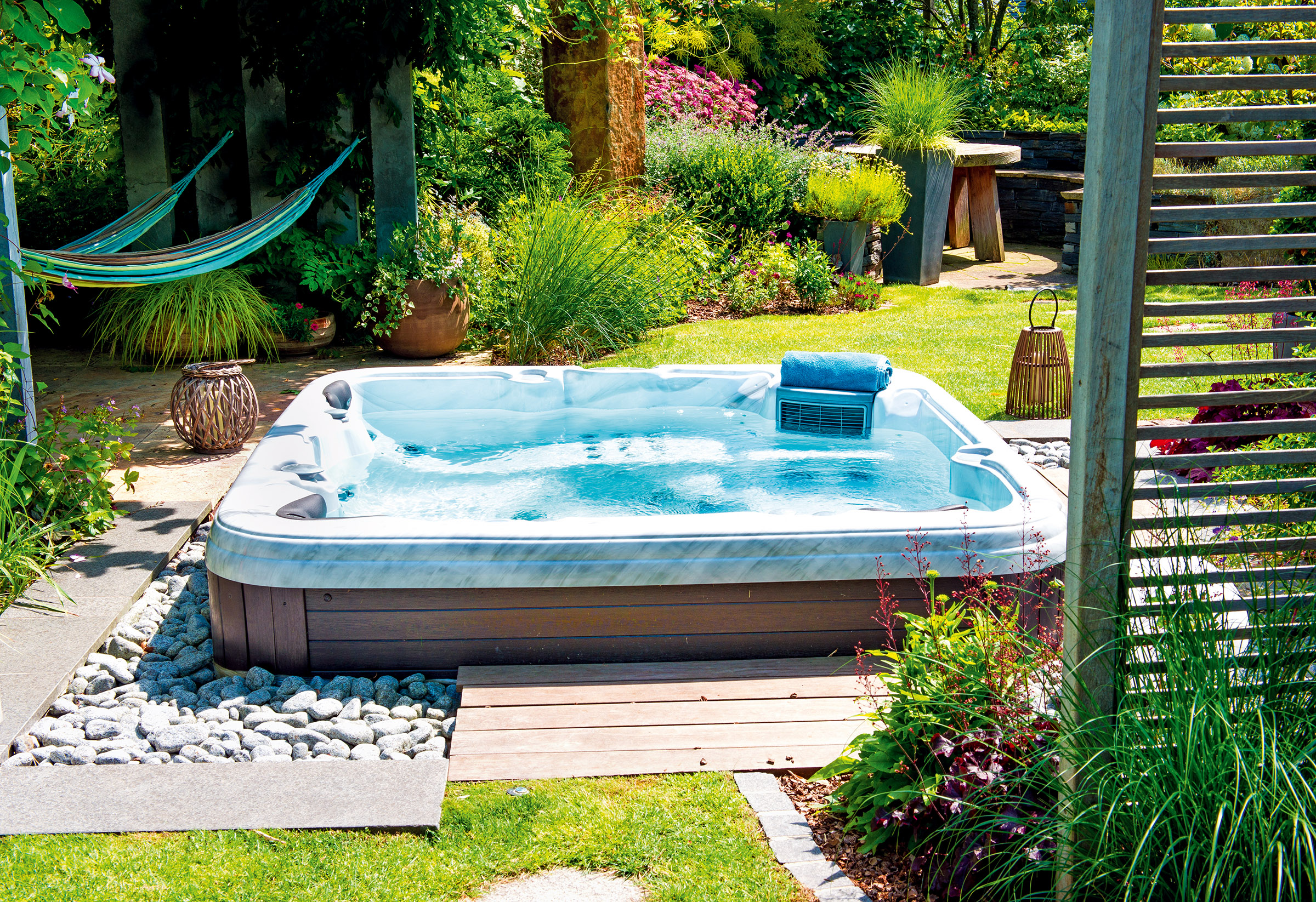 Aménagé dans un vaste jardin végétalisé, ce spa de nage de la marque Jacuzzi, allie performance et détente. Il offre
