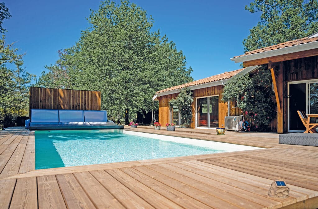 Plat, motorisé, sur roulette, l’abri dévoile la piscine et la couvre en moins d’une minute. Esthétique car discret, il se