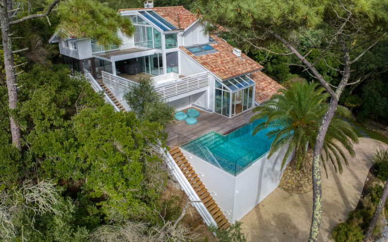 Ce spectaculaire couloir de nage en béton brut répond à l’architecture moderne de la villa et s’intègre idéalement dans son