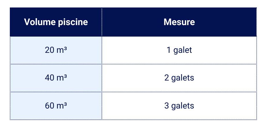 En entretien courant, on ajoute généralement 2 à 3 g par m³ pour maintenir le taux correct (à adapter selon concentration).