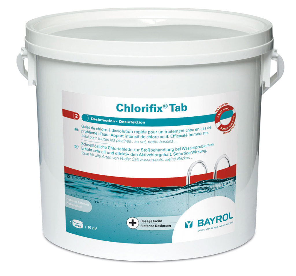Grâce à ses propriétés tout à la fois désinfectantes, oxydantes et algicides, le chlore est le produit de traitement préféré des Français. Qu’il soit stabilisé ou non, il existe sous de multiples formes (pastilles, galets, granulés, liquides…) pour s’adapter à toutes les situations. (BAYROL)