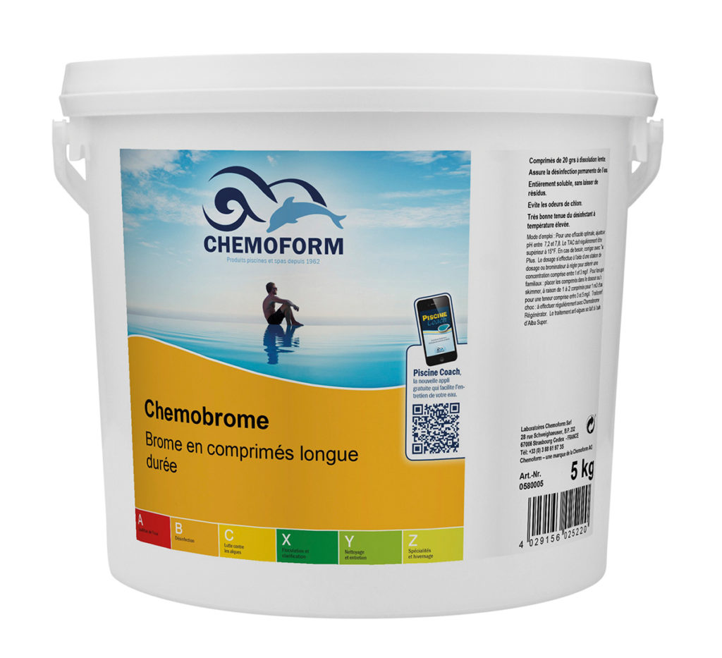Parent chimique du chlore, le brome, extrait de l’eau de mer, est un désinfectant performant même si le pH et la température de l’eau sont élevés. Sous forme de pastilles, il se prête particulièrement bien aux eaux plus chaudes des piscines d’intérieur et des spas. (Chemoform / CF Group France)
