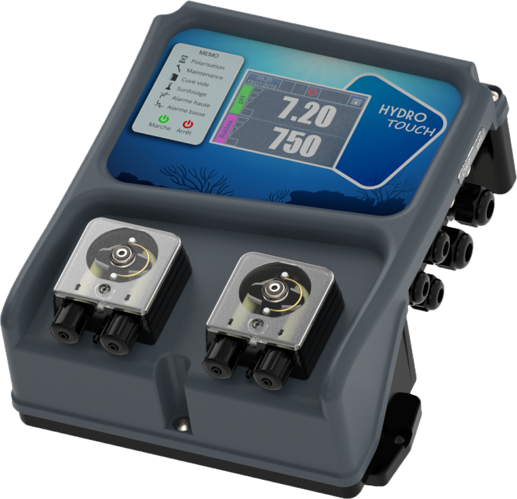 Une pompe doseuse régule automatiquement les paramètres de l’eau. Après analyse, elle injecte la bonne quantité de produit (pH, chlore, oxygène actif) pour rétablir l’équilibre de l’eau de la piscine. (Syclope Electronique)