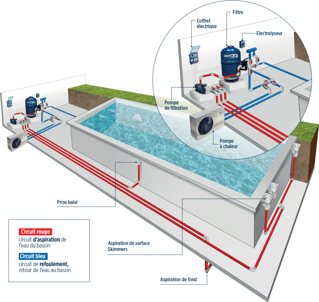 Dans une piscine, la qualité de l’eau est assurée aux ¾ par le travail mécanique de la filtration et non pas l’action chimique des désinfectants et autres produits de traitement. En faisant circuler l’eau, plusieurs fois par jour, les plus gros agents polluants sont piégés dans le filtre. Les produits de traitement agissent plus rapidement et plus efficacement sur une eau débarrassée de ses impuretés.
