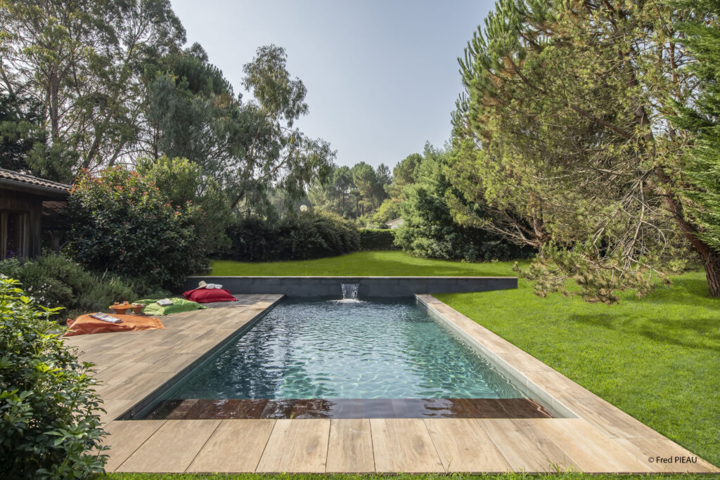 Plages et margelles : Grès Cérame 20 mm (imitation bois) posé sur plots