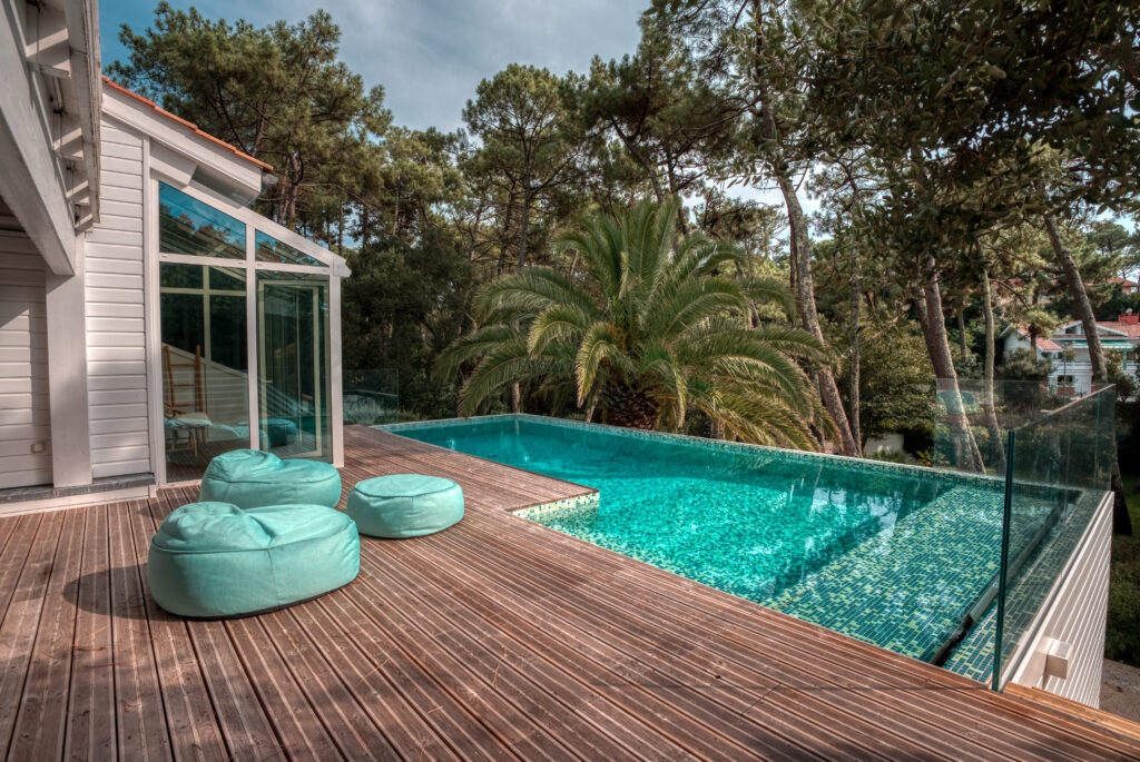 De forme simple, cette piscine d’une villa située à Hossegor masque sa complexité derrière une esthétique originale, en parfaite adéquation avec son environnement immédiat. Découvrez cette rénovation piscine originale et singulière