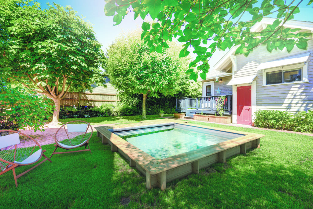 Une piscine semi-enterrée en bois au milieu de la verdure
