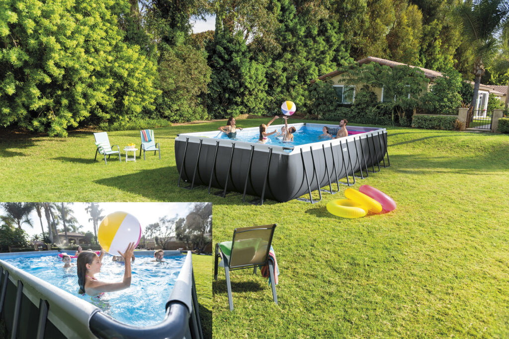 Piscine Ultra XTR. Design avec angles arrondis et bande blanche sur le pourtour, forme rectangulaire, disponible en 3 formats sur une même hauteur.