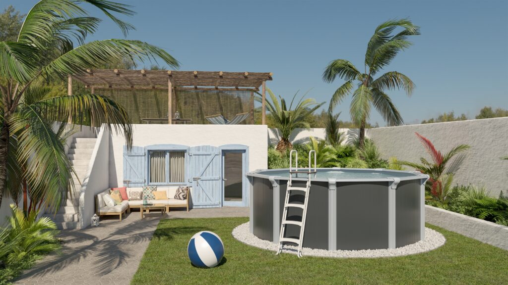 Piscine OSMOSE anthracite, ovale ou ronde. Paroi en acier ondulé galvanisée à chaud, pré-laquée et peinte, liner 42/100e bleu haute résistance.