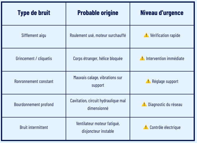 Une pompe qui chauffe anormalement ou dont le moteur commence à fatiguer peut générer des bruits électriques ou mécaniques :