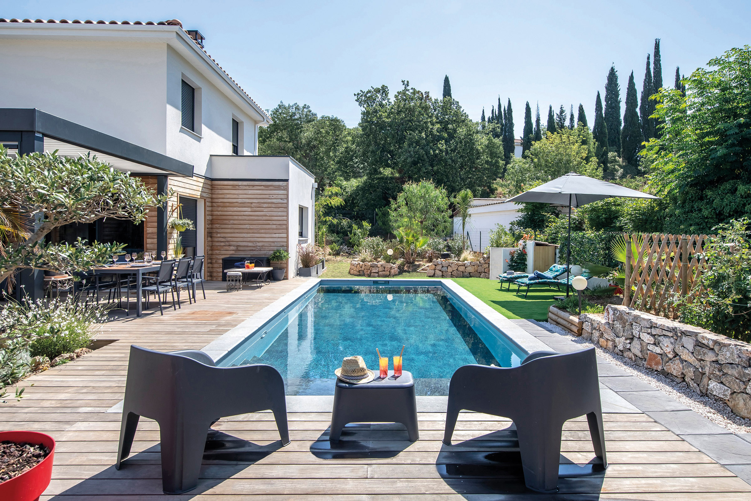 Le couloir de nage s’étend de tout son long dans ce jardin rigoureusement dessiné. Point d’orgue d’une réalisation où chaque