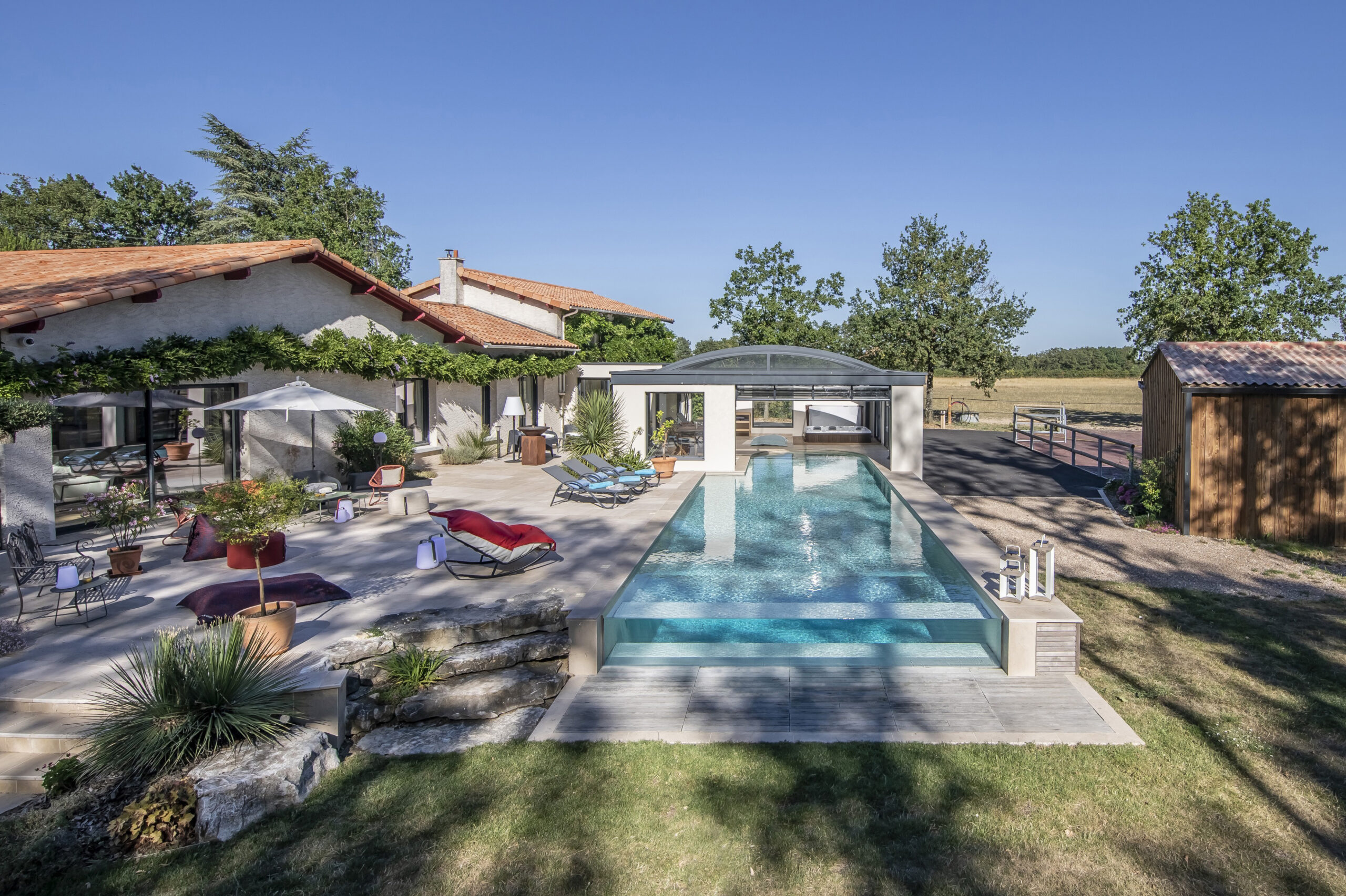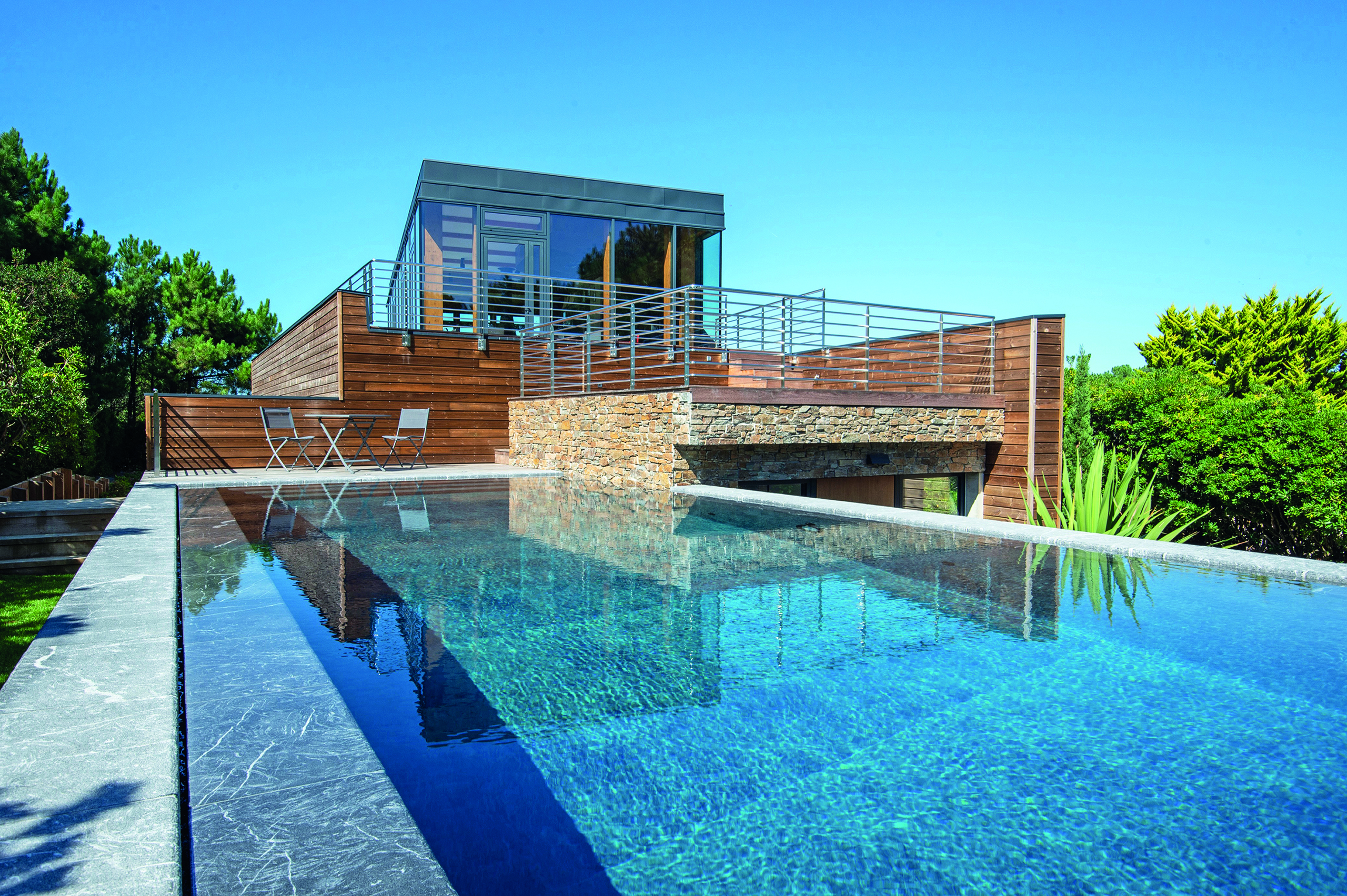 Rectangulaire et allant d’un bout à l’autre du terrain, la piscine en couloir de nage repousse les limites de la